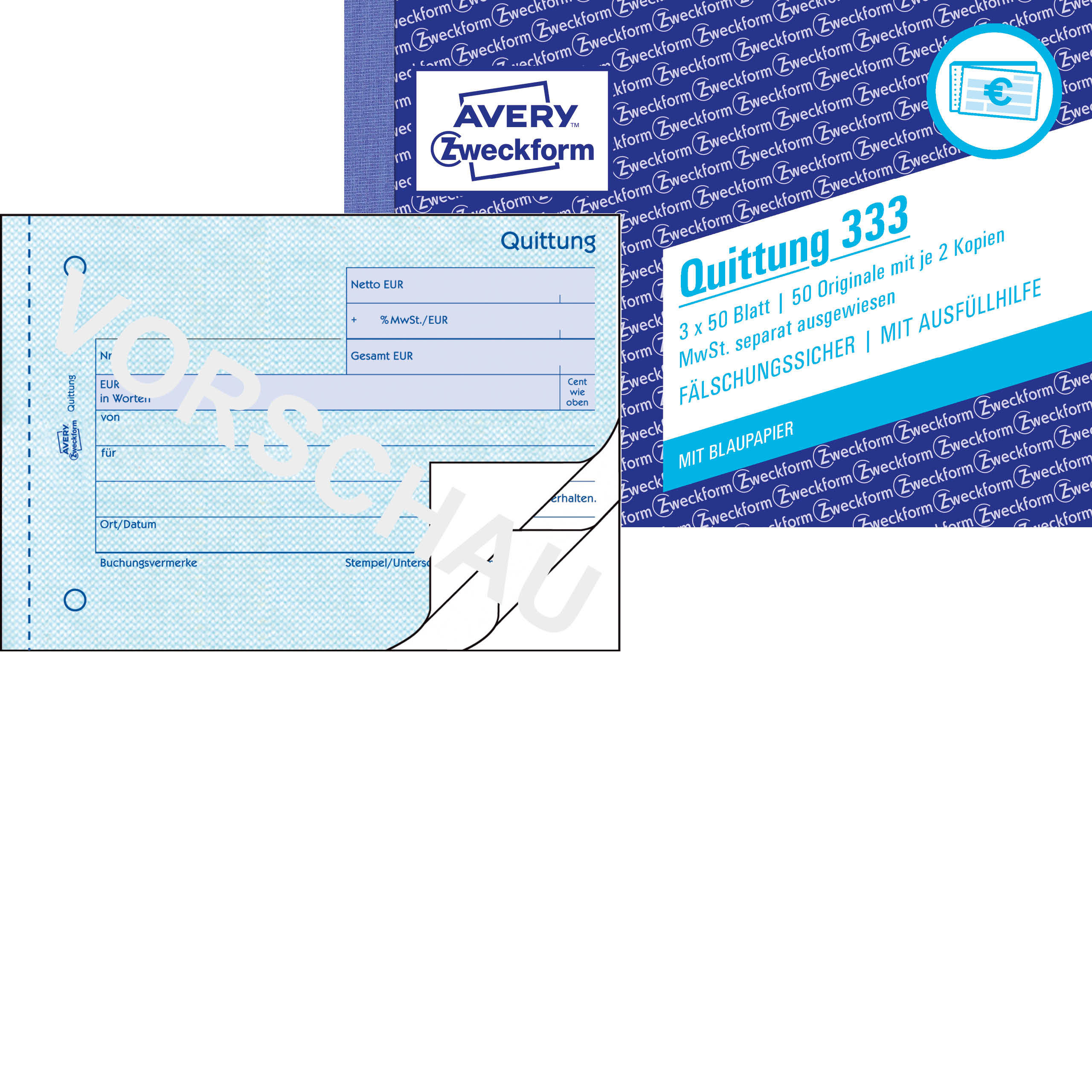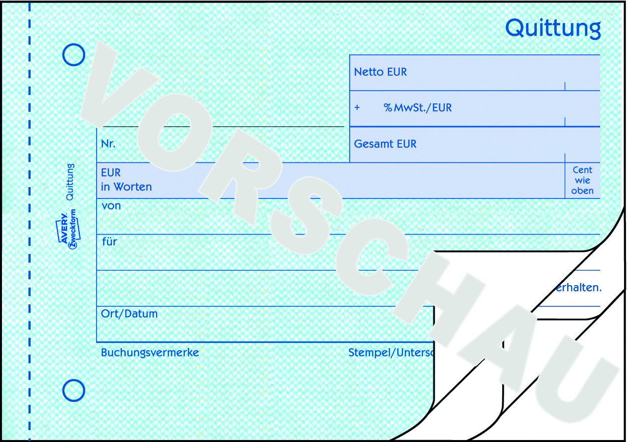 Das Formularbuch Quittung von AVERY Zweckform beinhaltet 3x 50 Blatt / 50 Originale mit je 2 Kopien, MwSt. separat ausgewiesen.Fälschungssicher / mit Ausfüllhilfe